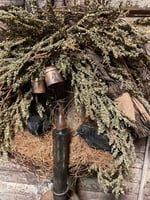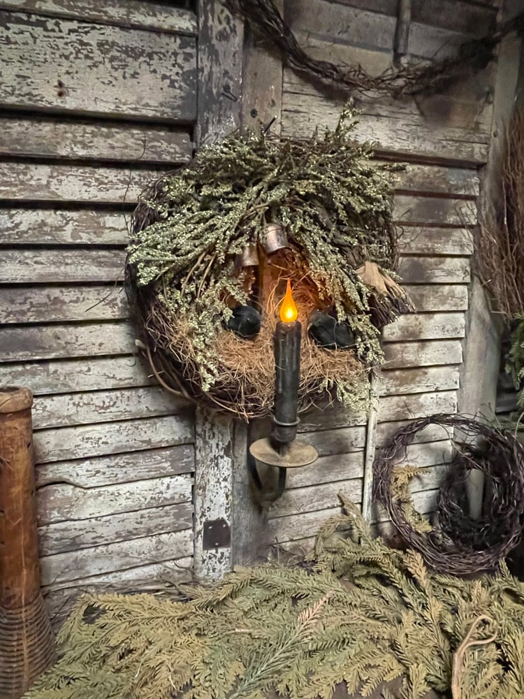 Details include... a distressed candle sconce with grungy candle, a grapevine wreath with spice dusted greenery, two crows a broom and coconut husk ,
