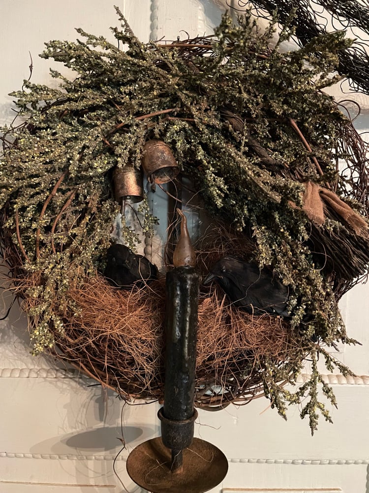 #1.. OLde Crows and Broom ~ Wreath ~ On Candle Sconce ~ Candle~