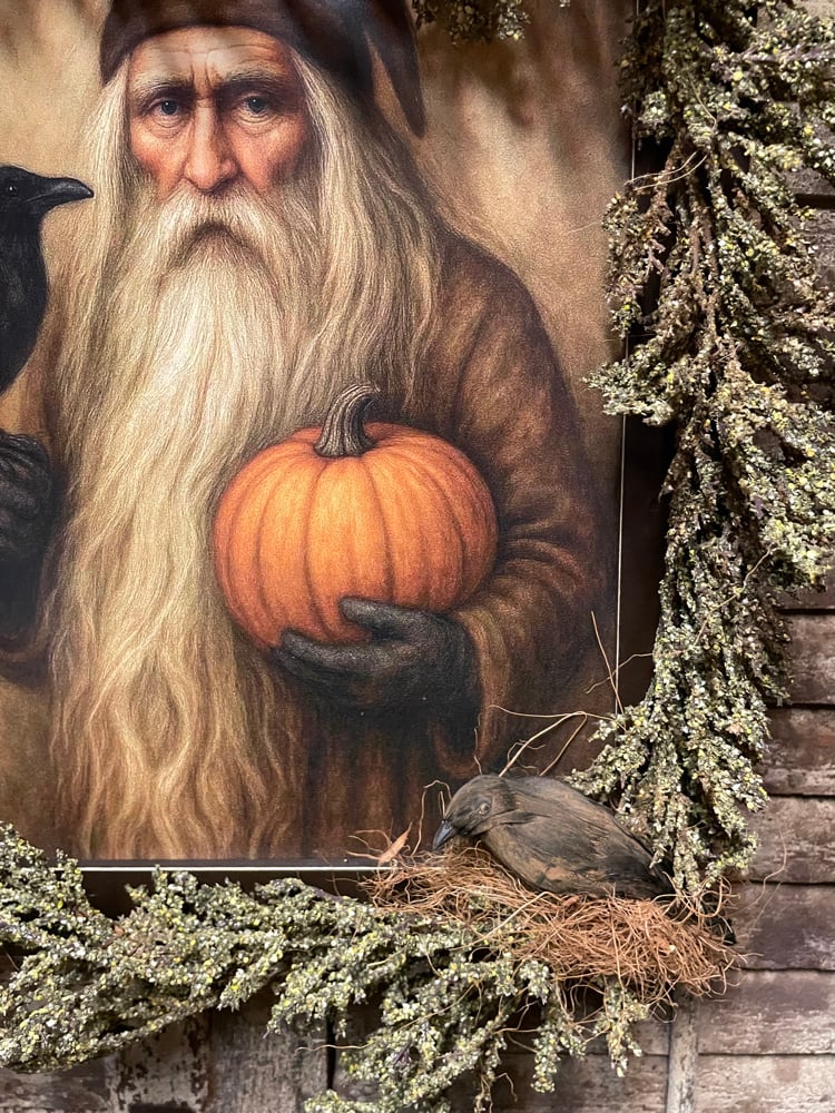Olde Harvest Thyme Santa holds a harvest thyme pumpkin with a watchful crow perched on his hand. Rich drab tones capture the spirit of Autumns mystery and 19th century charm.