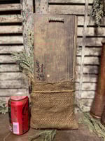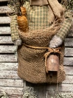 Details include.....a rabbit with wired ears and arms dressed in homespun with cheese cloth scarf, spice dusted greenery, a stained burlap bag with coconut husk, a distressed board, two carrots and a hand forged bell.