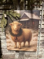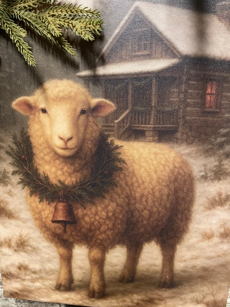 In the hush of snowfall, a gentle woolen guardian stands before cabin the door, wreath and bell at the ready ~ keeping quiet watch over a Christmas home filled with warmth and peace