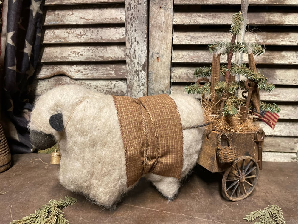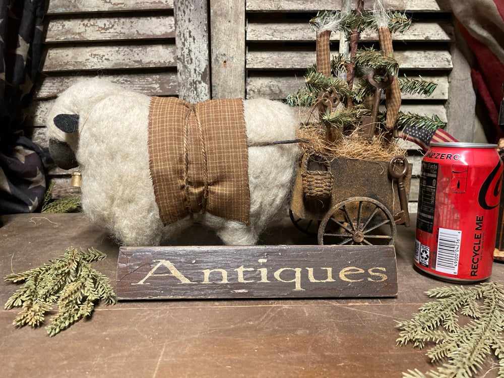 Details include... a muslin sheep covered with needle felted sheep wool, a hand forged bell, homespun blanket, a painted and spice dusted wood cart with metal wheels, homespun stockings, skeleton keys, an American flag ,mini basket and a perfectly prim sign that reads ANTIQUES ~
